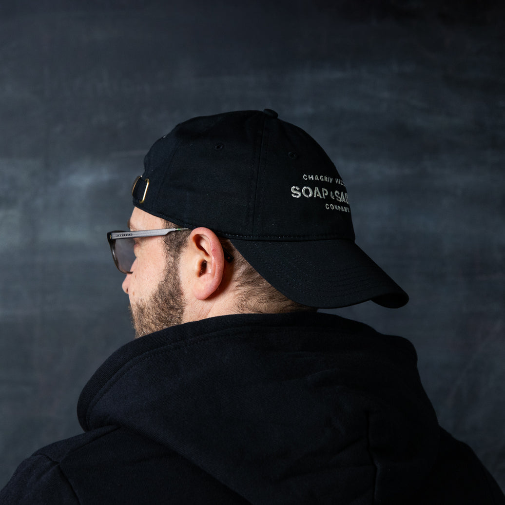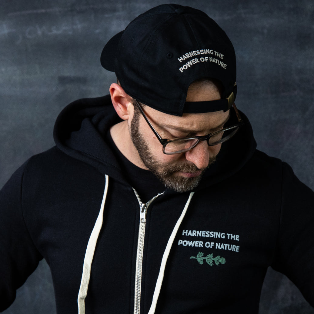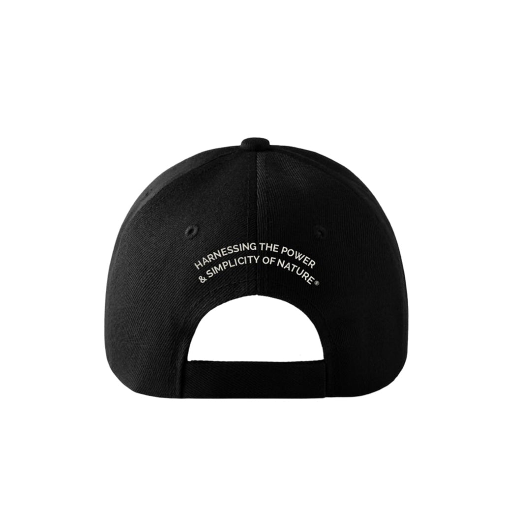 The black cap has our logo embroidered on the front in white and the our motto "Harnessing the Power of Nature" is embroidered on the back in an arch above the adjustable strap.