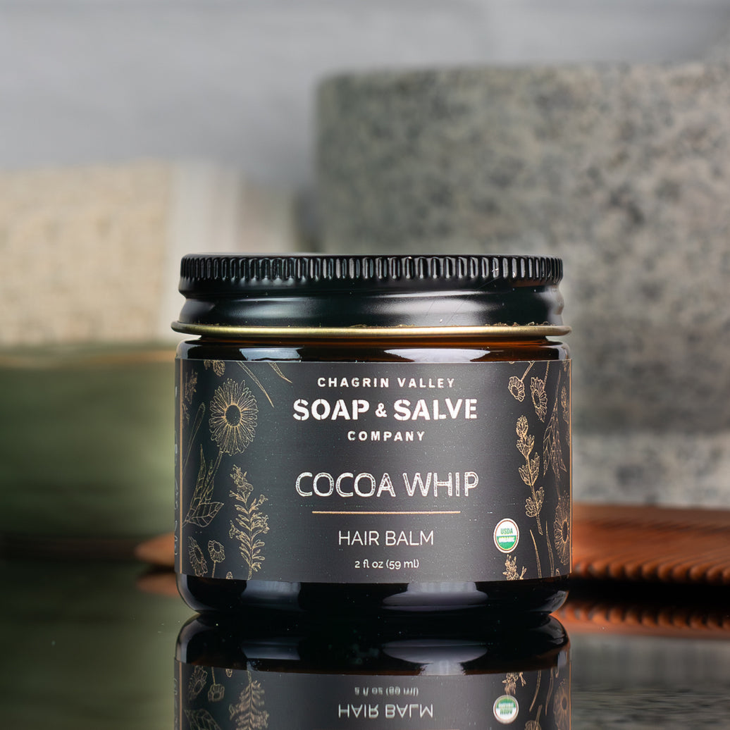 Our whipped organic cocoa butter hair balm is a natural emollient and moisturizer. Whipped up fluffy and delicate, and a bit lighter than our Creamy Shea hair balm, the creamy texture of our cocoa butter hair balm infuses hair strands to lock in moisture and help prevent breakage. People with curly hair often swear by cocoa butter for its ability to prevent shrinkage and tame coarse porous hair.